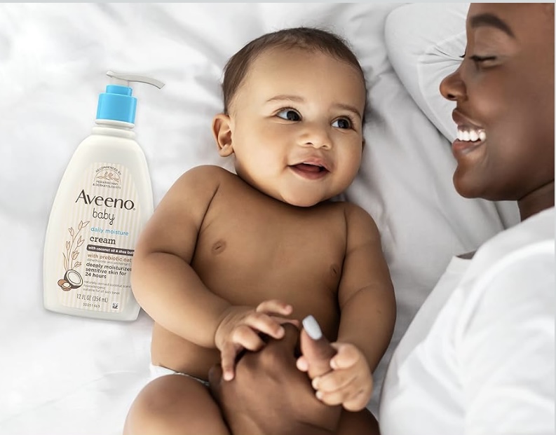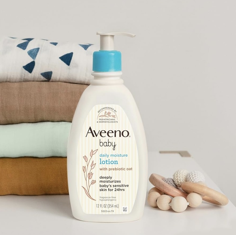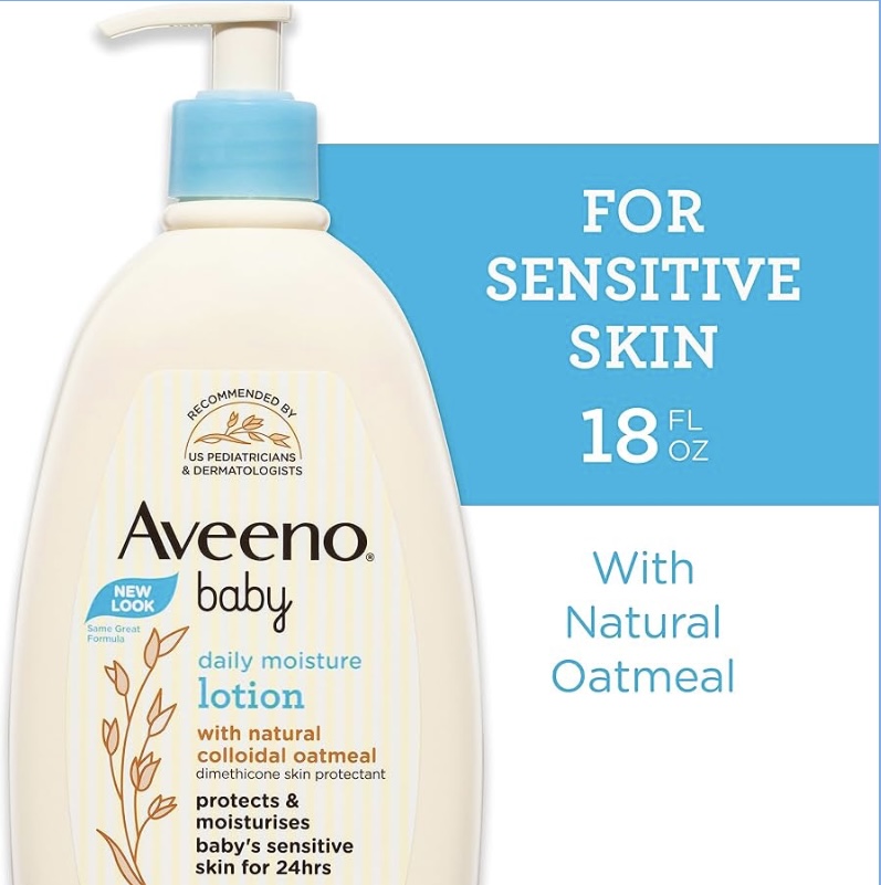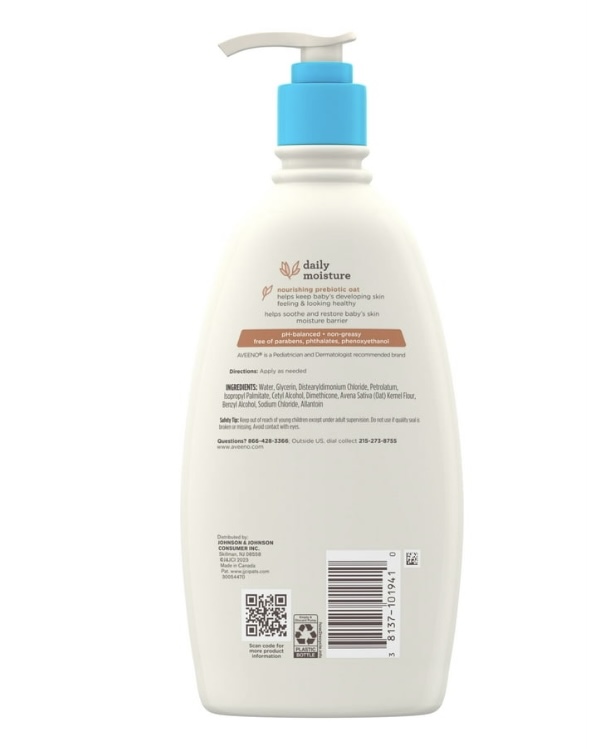 Deeply moisturize your little one's delicate skin for a full 24 hours with Aveeno Baby Daily Moisture Body Lotion with nourishing prebiotic oat. This nourishing baby body lotion is specially formulated to be gentle enough for baby's delicate and sensitive skin. Formulated with oatmeal, this lotion moisturizes sensitive skin for a full 24 hours. The fast-absorbing, non-greasy formula helps deeply moisturize baby's delicate skin. This hypoallergenic baby lotion can be used every day to keep your baby's skin soft, smooth, and healthy-looking. From Aveeno, a pediatrician and dermatologist-recommended brand, the non-greasy lotion formula is free from fragrance, parabens, steroids, phenoxyethanol and phthalates, so it is gentle for baby's sensitive skin.