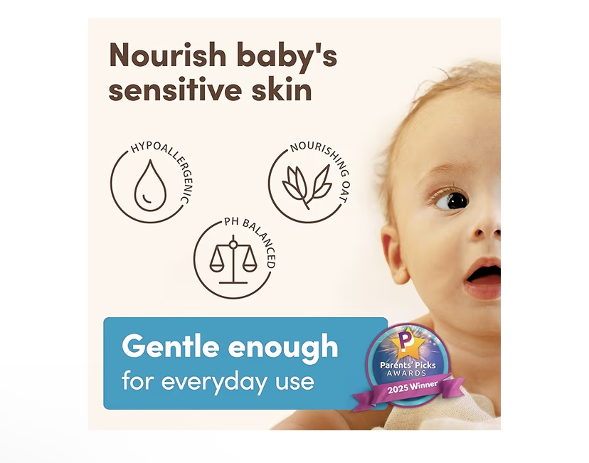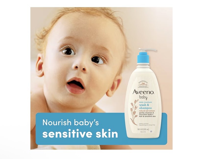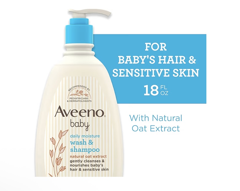 Aveeno Baby Daily Moisture Body Wash & Shampoo with Oat Extract gently cleanses and nourishes delicate baby hair and skin while supporting everyday bath routines. From our dermatologist and pediatrician recommended brand, this hypoallergenic, pH-balanced, tear-free baby wash and shampoo is formulated without soap, parabens, sulfates, and phenoxyethanol. The rich lather rinses clean without residue and leaves a light, fresh fragrance that is not overpowering, making it a comfortable choice for sensitive noses.Formulated with carefully extracted oat extract, it helps soothe and nourish delicate skin as it cleans, providing a soft, cared-for feel from top to bottom. Designed for daily use, this gentle 2-in-1 baby wash and shampoo helps keep skin from feeling dry, leaving hair soft and easy to manage. The large 33 fl oz bottle offers dependable value for families. For best results, dispense onto wet hands or a washcloth, work into a gentle foam, apply to hair and body, and rinse thoroughly. Lightly scented with a soft, fresh aroma, it’s suitable for morning or evening baths. The soap-free formula provides a thorough yet gentle cleanse you can rely on for sensitive hair and skin every day.
