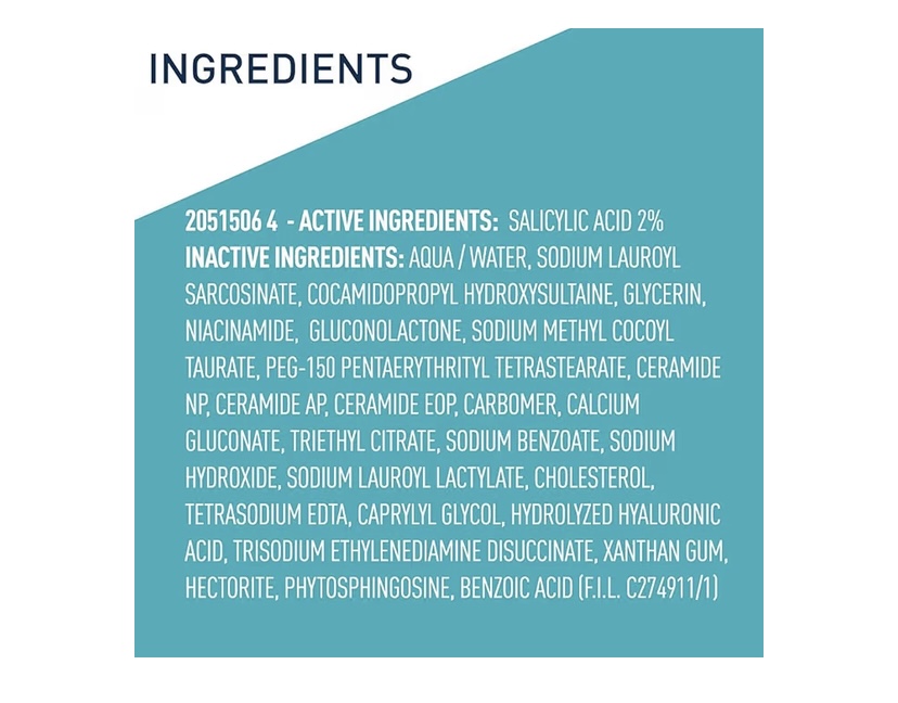 ACTIVE INGREDIENTS: SALICYLIC ACID 2% INACTIVE INGREDIENTS: WATER, SODIUM LAUROYL SARCOSINATE, COCAMIDOPROPYL HYDROXYSULTAINE, GLYCERIN, NIACINAMIDE, GLUCONOLACTONE, SODIUM METHYL COCOYL TAURATE, PEG-150 PENTAERYTHRITYL TETRASTEARATE, CERAMIDE NP, CERAMIDE AP, CERAMIDE EOP, CARBOMER, CALCIUM GLUCONATE, TRIETHYL CITRATE, SODIUM BENZOATE, SODIUM HYDROXIDE, SODIUM LAUROYL LACTYLATE, CHOLESTEROL, TETRASODIUM EDTA, CAPRYLYL GLYCOL, HYDROLYZED HYALURONIC ACID, TRISODIUM ETHYLENEDIAMINE DISUCCINATE, XANTHAN GUM, HECTORITE, PHYTOSPHINGOSINE, BENZOIC ACID