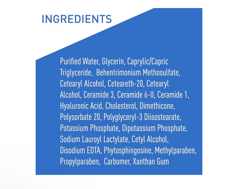 Aqua/Water/Eau, Glycerin, Caprylic/Capric Triglyceride, Cetearyl Alcohol, Cetyl Alcohol, Potassium Phosphate, Ceramide Np, Ceramide Ap, Ceramide Eop, Carbomer, Dimethicone, Ceteareth-20, Behentrimonium Methosulfate, Methylparaben, Sodium Lauroyl, Lactylate, Cholesterol, Disodium EDTA, Dipotassium Phosphate, Propylparaben, Hydrolyzed Hyaluronic Acid, Phytosphingosine, Xanthan Gum, Polysorbate 20, Polygylceryl-3 Diisostearate. Code F.I.L. D215763/2.