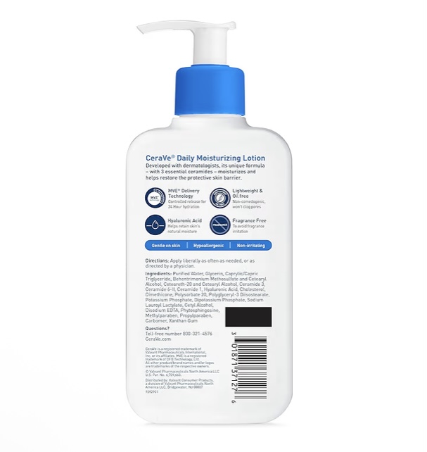 Developed with dermatologists, CeraVe Daily Moisturizing Lotion has a unique, lightweight & non-greasy formula that provides 24-hour hydration and helps restore the protective skin barrier with three essential ceramides (1,3,6-II). The formula also contains hyaluronic acid to help retain skin’s natural moisture. This oil-free moisturizer with hyaluronic acid leaves the skin feeling comfortable and is gentle on skin.