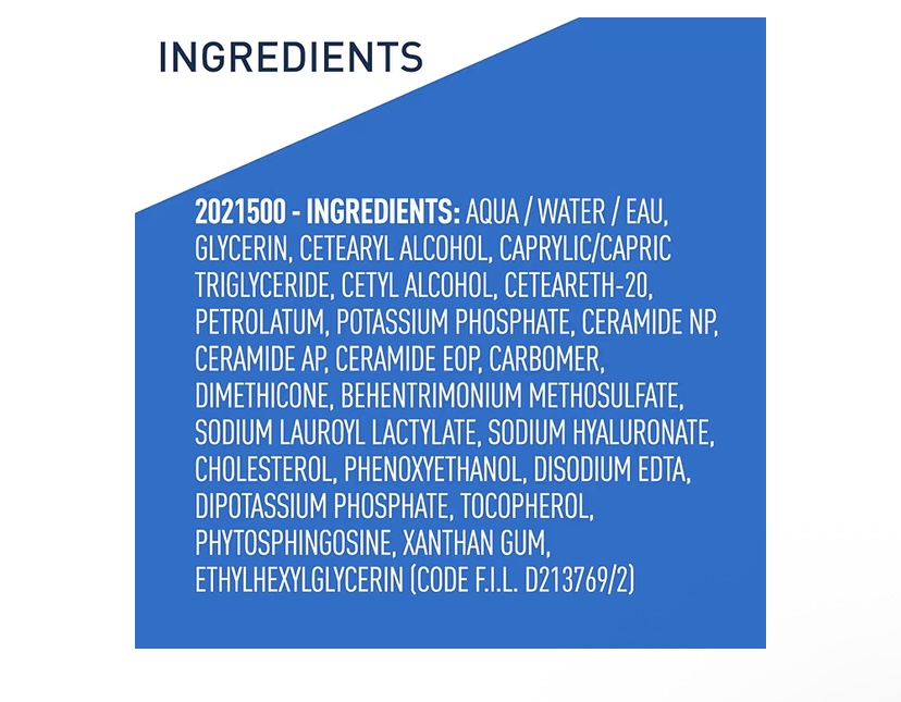 AQUA / WATER / EAU, GLYCERIN, CETEARYL ALCOHOL, CAPRYLIC/CAPRIC TRIGLYCERIDE, CETYL ALCOHOL, CETEARETH-20, PETROLATUM, POTASSIUM PHOSPHATE, CERAMIDE NP, CERAMIDE AP, CERAMIDE EOP, CARBOMER, DIMETHICONE, BEHENTRIMONIUM METHOSULFATE, SODIUM LAUROYL LACTYLATE, SODIUM HYALURONATE, CHOLESTEROL, PHENOXYETHANOL, DISODIUM EDTA, DIPOTASSIUM PHOSPHATE, TOCOPHEROL, PHYTOSPHINGOSINE, XANTHAN GUM, ETHYLHEXYLGLYCERIN