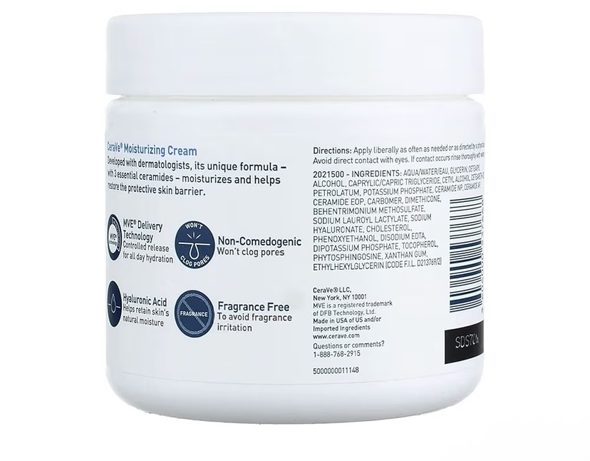 Developed with dermatologists, CeraVe Moisturizing Cream has a unique formula that provides 24-hour hydration and helps restore the protective skin barrier with three essential ceramides (1,3,6-II) and hyaluronic acid. This rich, non-greasy, fast-absorbing formula is ideal for sensitive skin on both the face and body Featuring our patented MVE Technology to release a steady stream of moisturizing ingredients throughout the day and night.