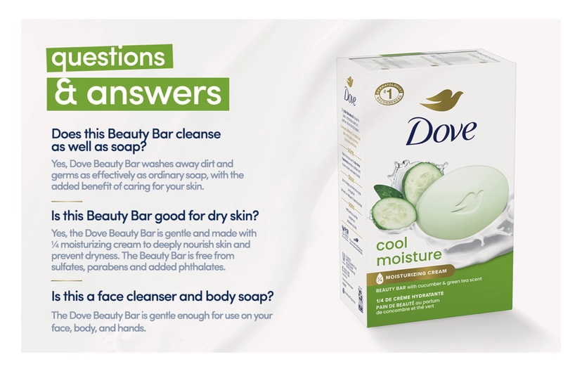 This Dove Beauty Bar offers a crisp & refreshing experience. Unlike ordinary bar soap, the Beauty Bar is made with 1/4 moisturizing cream to deeply nourish skin and prevent dryness. This cleansing bar is uniquely created with 1/4 moisturizing cream and a plant-based cleanser for skin care that maintains pH balance and the natural skin barrier. Made with cucumber & green tea scent, this gentle skin cleanser is multi-purpose: gently washing away dirt and oil while invigorating your skin . It is gentle enough for use on face, hands, and body, allowing it to be used as a facial cleanser as well as body soap bar. To use this Cool Moisture Beauty Bar, wet your hands and gently lather the Beauty Bar between them, then apply the lather to your face or body before rinsing thoroughly with water. As the #1 dermatologist recommended bar brand, the Dove Beauty Bar formula is free from sulfate cleansers, parabens, and phthalates. Dove believes real beauty is cruelty-free. Globally, Dove does not test on animals and is certified as PETA Approved. Through the Dove Self-Esteem Project, Dove helps parents, mentors, teachers, and youth leaders deliver self-esteem education that’s reached more than 60 million young people so far. By 2030, their mission is to have helped ¼ billion build positive body confidence.