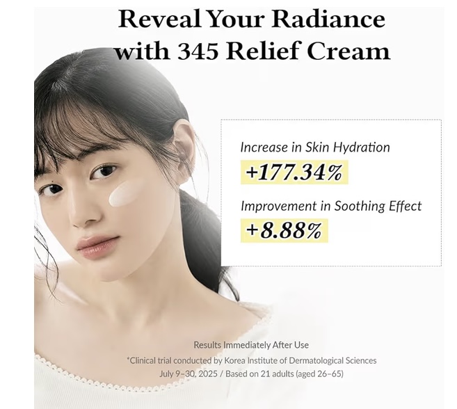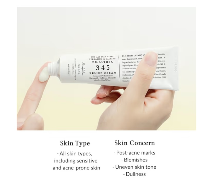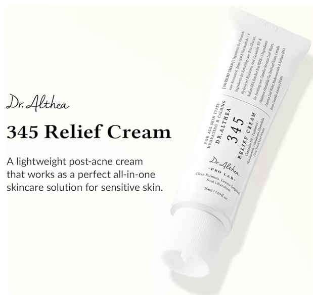 . DAILY RELIEF & SOOTHING CARE : 345 Relief Cream offers a moisturizing texture with a silky finish without any greasy feeling. Clinically tested as non-comedogenic, it is safe and gentle for acne-prone skin, making it ideal for use anytime as part of your post-acne skincare routine.
