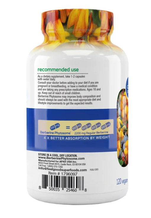 FeelGood Superfoods® Berberine Phytosome™i s your natural ally for your good health and well-being. Using Berbevis® as its source – with its Phytosome delivery system – enables this formula to offer improved bioavailability and tolerability versus standard berberine.