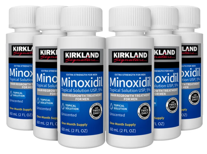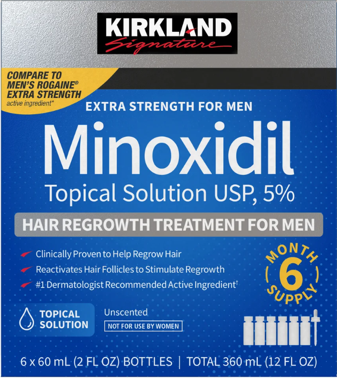 Kirkland Signature Hair Regrowth Treatment Extra Strength for Men, 5% Minoxidil Topical Solution, 2 fl oz, 6-pack.