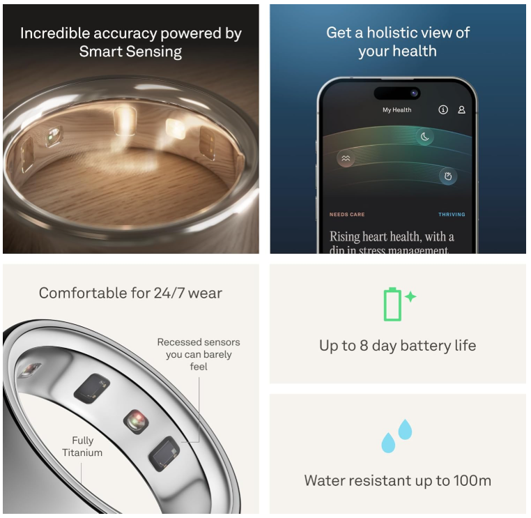 - ACCURACY - SMART SENSING - Oura tracks over 50 health metrics, including sleep, activity, stress, heart health, and women’s health metrics. Oura Ring 4 is powered by Smart Sensing, which adapts to you — delivering accurate, continuous data, day and night