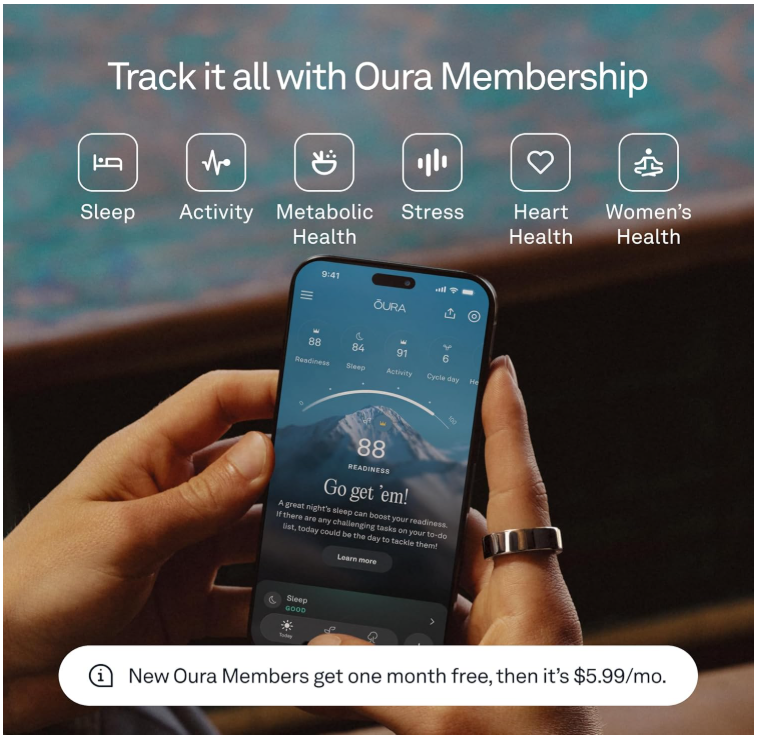 - OURA MEMBERSHIP - First month of membership is included with purchase, for new members only. Subscription is 5.99/mo afterwards. Membership is tied to your account via the Oura App, not your physical ring