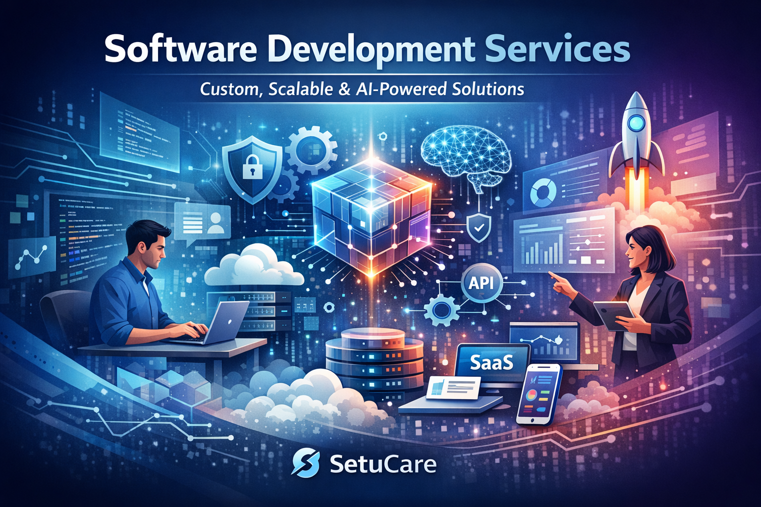 Get high-quality custom software development services from SetuCare. We build scalable, secure, and AI-powered web applications, SaaS platforms, and enterprise solutions tailored to your business needs.