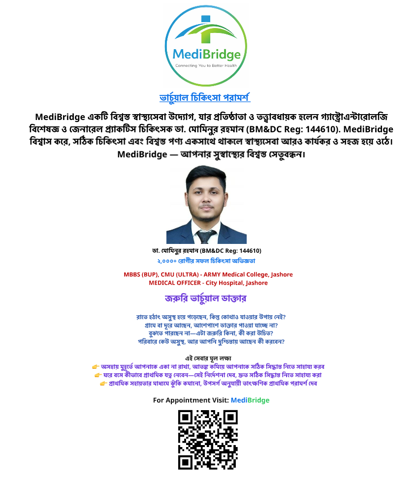 এই সেবা শুধুমাত্র প্রাথমিক পরামর্শের জন্য। গুরুতর বা জীবন-ঝুঁকিপূর্ণ অবস্থায় দ্রুত নিকটস্থ হাসপাতালে যোগাযোগ করুন।
