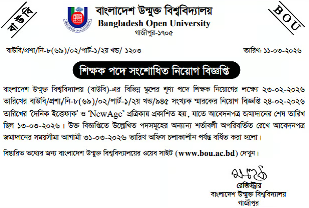 বাংলাদেশ উন্মুক্ত বিশ্ববিদ্যালয়ে বিভিন্ন শূন্য পদে শিক্ষক নিয়োগে আবেদনে সময় বৃদ্ধি করা হয়েছে। ২৩ ও ২৪ ফেব্রুয়ারি ২০২৬ গণমাধ্যমে প্রকাশিত বিজ্ঞপ্তিতে আবেদনের শেষ সময় ছিল ১৩ মার্চ ২০২৬ (অফিস চলাকালে)। এখন আগ্রহীরা এসব পদে আবেদন করতে পারবেন ৩১ মার্চ ২০২৬ পর্যন্ত।