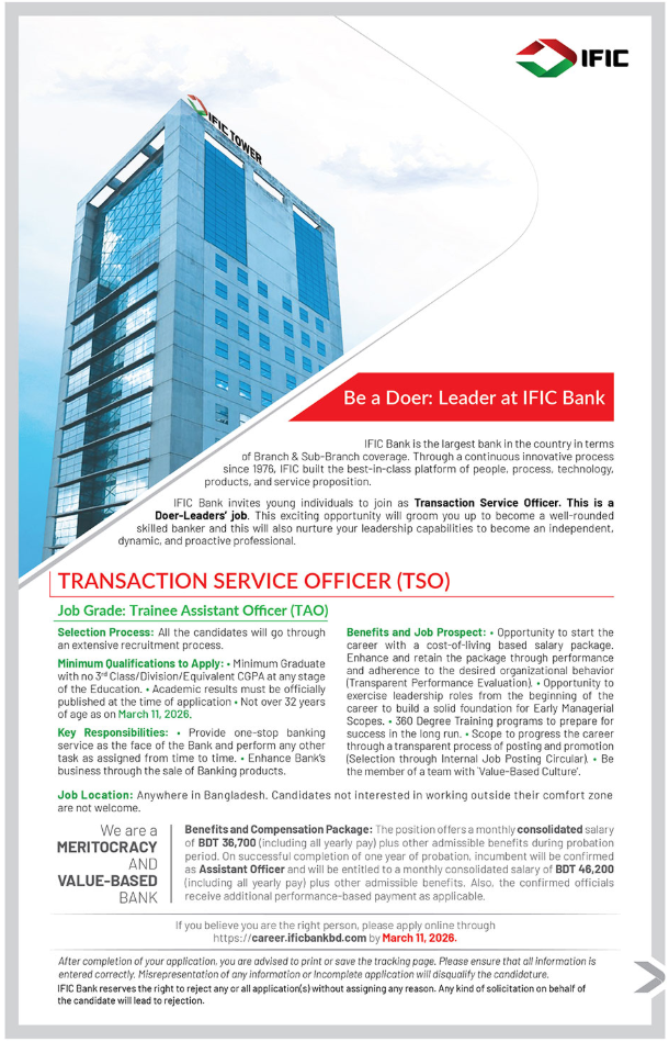আবেদনপদ্ধতি: আগ্রহী প্রার্থীরা আবেদনের বিস্তারিত জানতে https://ificbank.com.bd/career করুন। অনলাইনের মাধ্যমে আবেদন করতে পারবেন শিক্ষার্থীরা।
