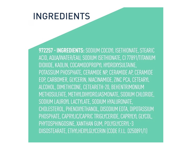 SODIUM COCOYL ISETHIONATE, STEARIC ACID, AQUA / WATER / EAU, SODIUM ISETHIONATE, CI 77891 / TITANIUM DIOXIDE, KAOLIN, COCAMIDOPROPYL HYDROXYSULTAINE, POTASSIUM PHOSPHATE, CERAMIDE NP, CERAMIDE AP, CERAMIDE EOP, CARBOMER, GLYCERIN, NIACINAMIDE, ZINC PCA, CETEARYL ALCOHOL, DIMETHICONE, CETEARETH-20, BEHENTRIMONIUM METHOSULFATE, METHYLDIHYDROJASMONATE, SODIUM CHLORIDE, SODIUM LAUROYL LACTYLATE, SODIUM HYALURONATE, CHOLESTEROL, PHENOXYETHANOL, DISODIUM EDTA, DIPOTASSIUM PHOSPHATE, CAPRYLIC/CAPRIC TRIGLYCERIDE, CAPRYLYL GLYCOL, PHYTOSPHINGOSINE, XANTHAN GUM, POLYGLYCERYL-3 DIISOSTEARATE, ETHYLHEXYLGLYCERIN