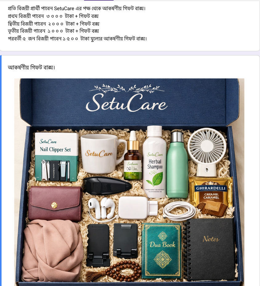 প্রতি বিজয়ী প্রার্থী পাবেন SetuCare এর পক্ষ থেকে আকর্ষণীয় গিফট বাক্স।